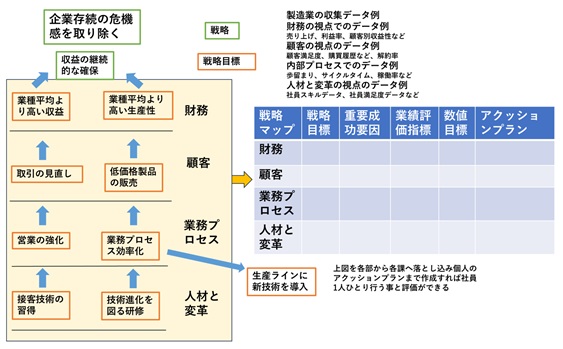 従来の、過去のデータである財務データだけに頼っていた経営を、財務の視点、顧客の視点、業務プロセスの視点、人材と改革の視点を加えて企業戦略を実行する為にマップにしたものです。